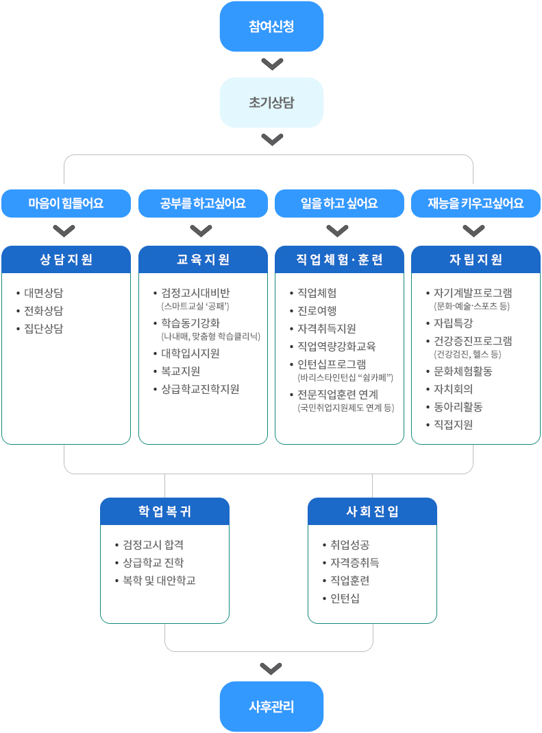 - 학교에서 연계되는 잠재적 학교 밖 청소년들을 대상으로 상담전문가와의 개인상담을 진행하여 어려움을 극복하고 학교에 재적응할 수 있도록 지원